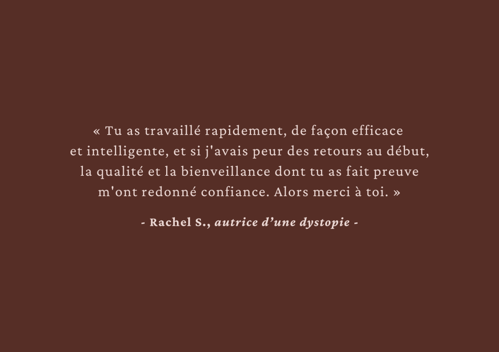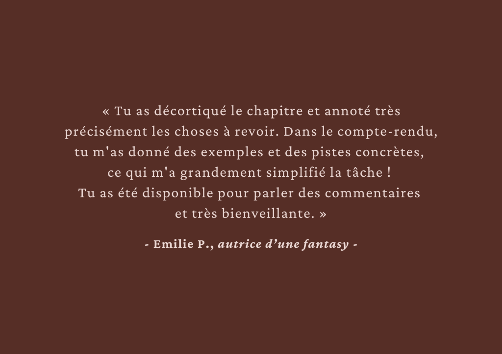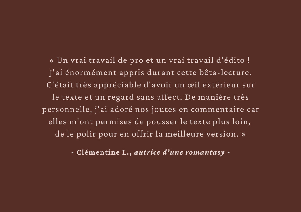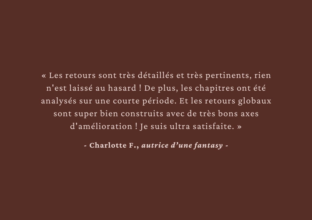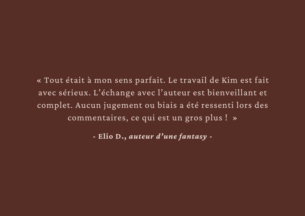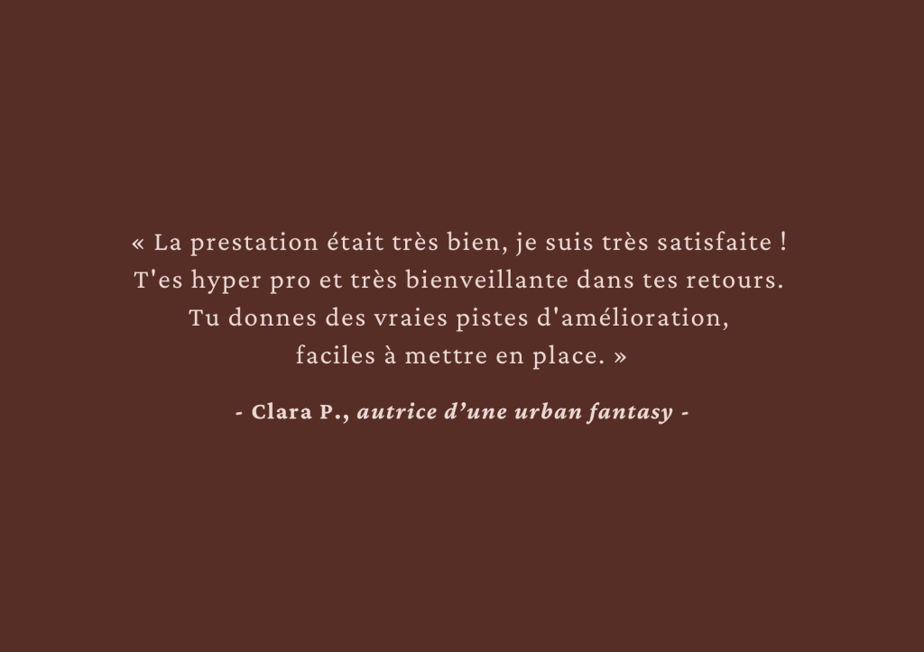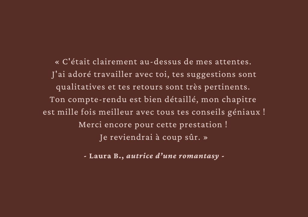 Analyse éditoriale sur le début de ton manuscrit, accompagnement pendant l’écriture du 1er jet ou analyse complète et approfondie, n’hésite pas à me contacter par mail pour qu’on en discute !