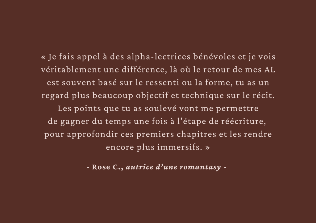 Tu as une idée de roman, mais besoin d’un suivi régulier à chaque chapitre pour aller au bout de l’écriture de ton 1er jet ? L’alpha-lecture est faite pour toi !