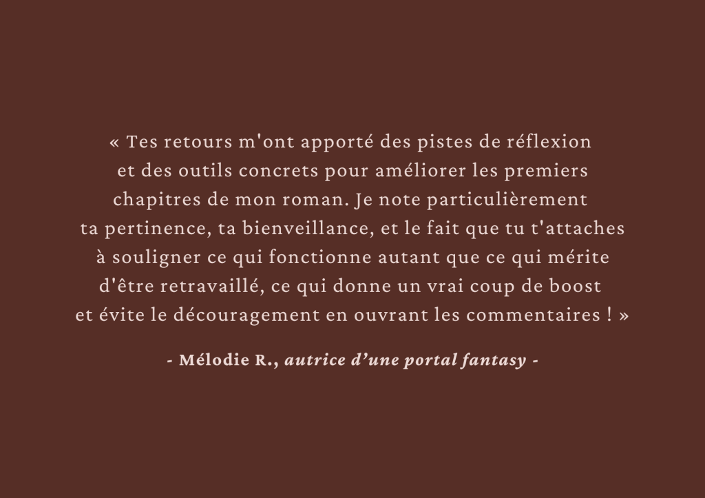 Cette relecture professionnelle est un véritable diagnostic stratégique qui t’aide à prendre du recul sur ton texte et à identifier ses points forts et ses pistes d’amélioration éventuelles pour renforcer l’impact de l’entrée dans le récit.